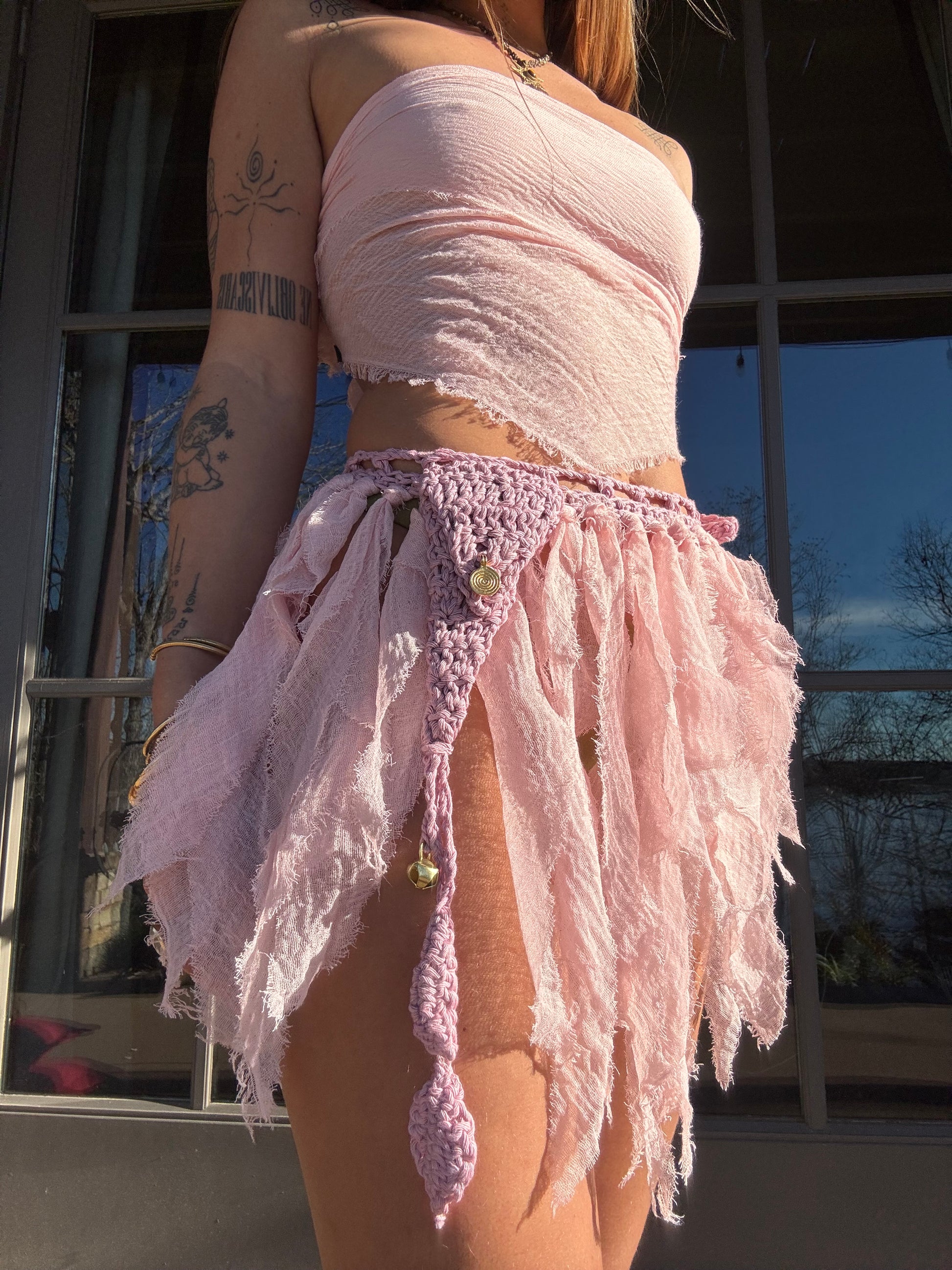 The most fairy of them all <3 Adjustable skirt, ties to any size. Features a trinket pocket with a little gold bell attached. Top comes free! It is the left over fabric I used for the skirt tied into a top :)