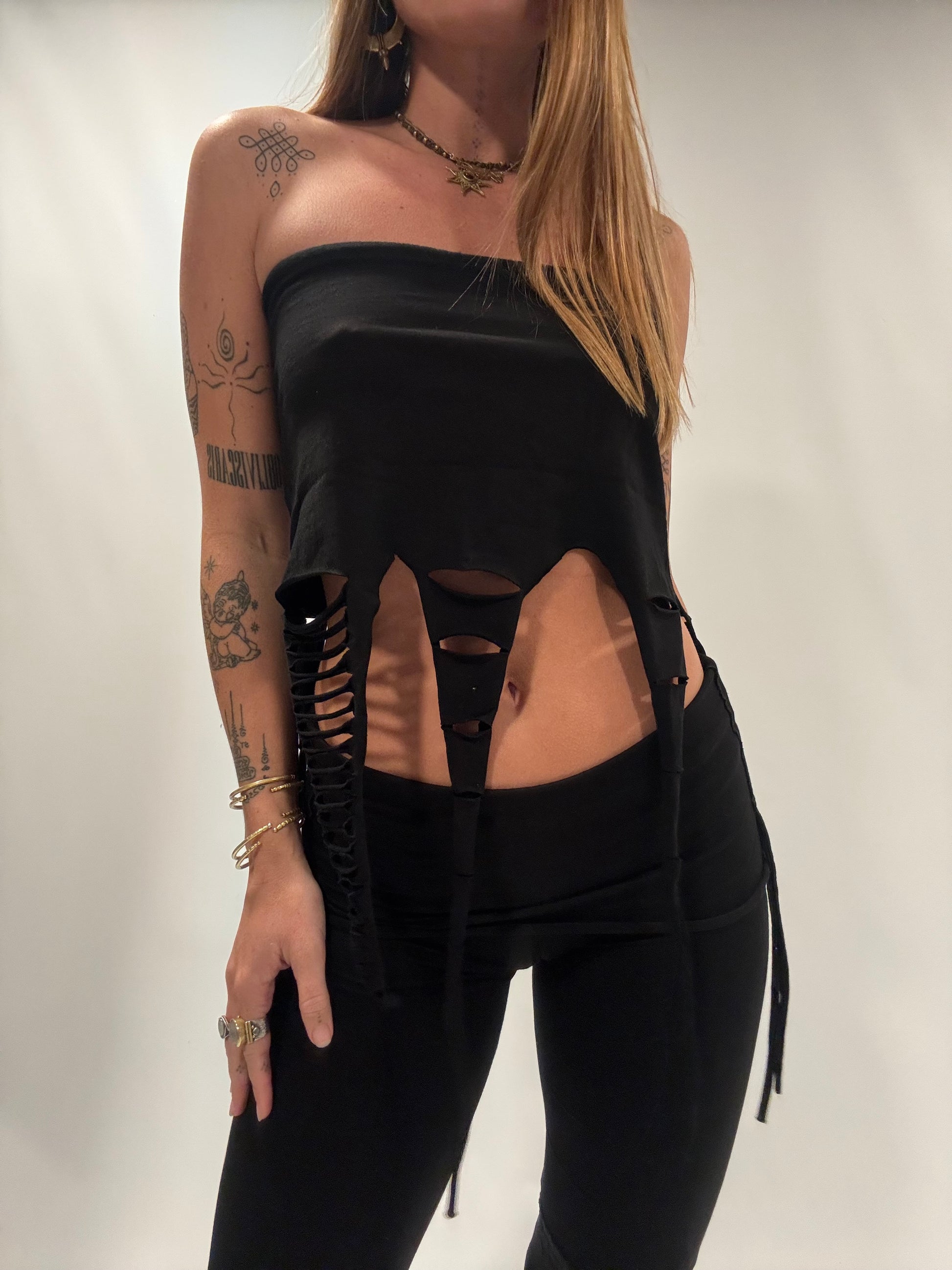 Mini skirt with ribbed detail plus adjustable tie. One size, best fit XS-M. Can also be worn as a top!