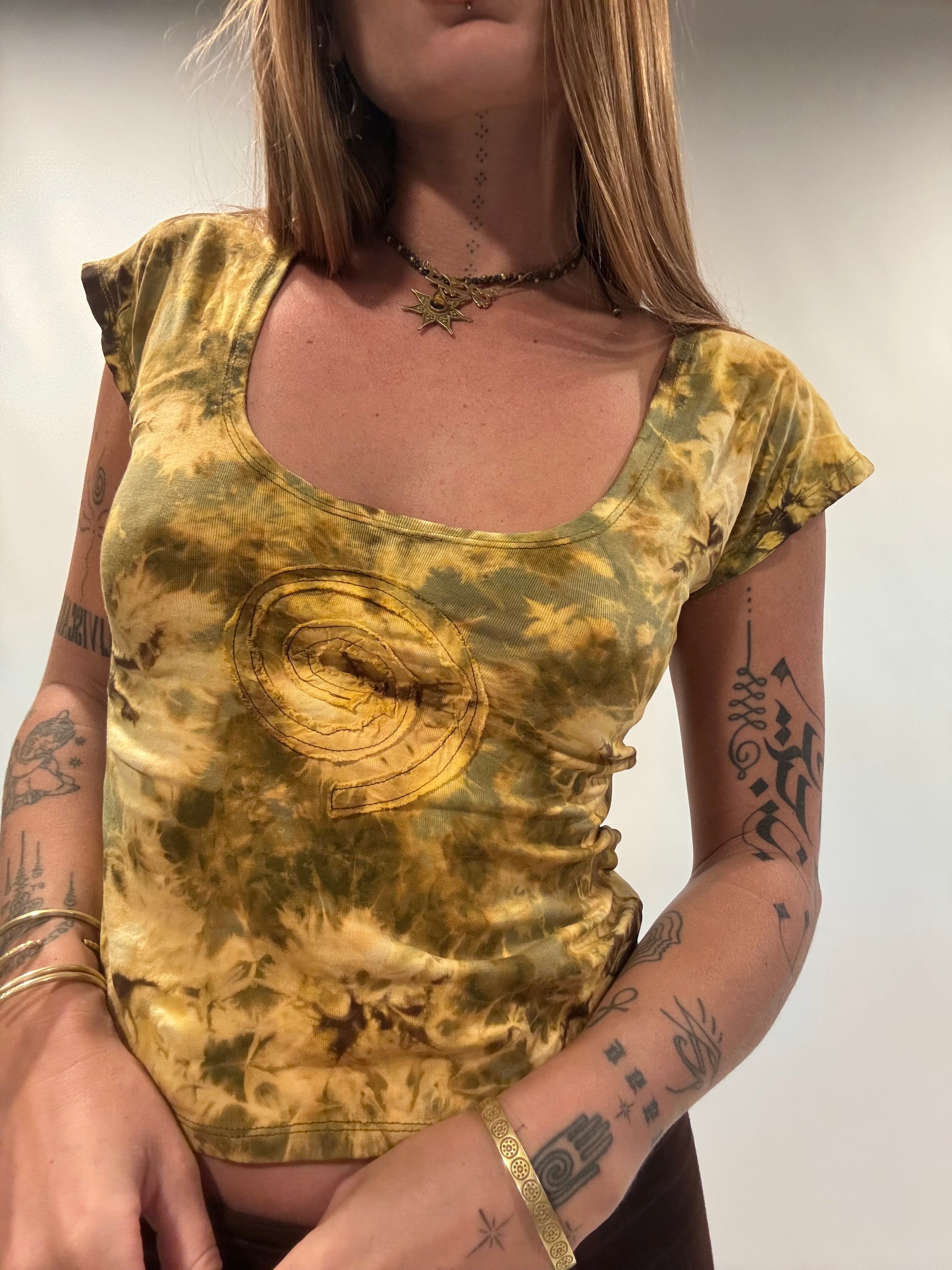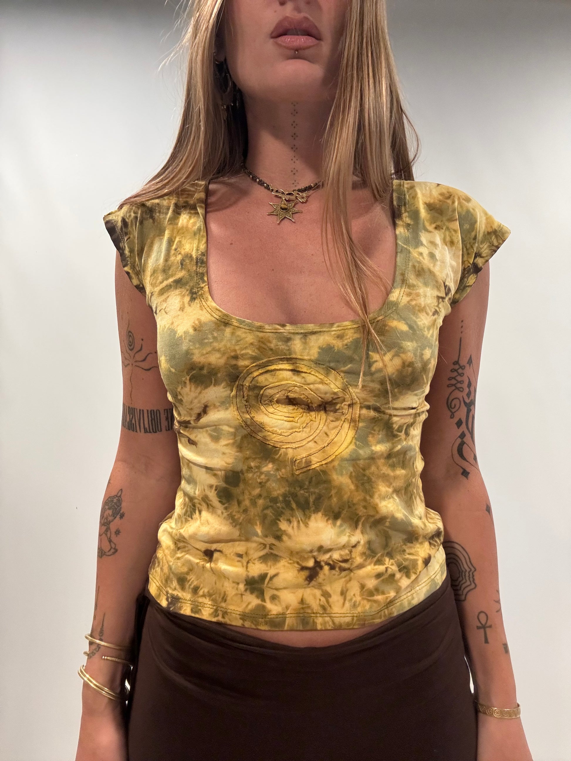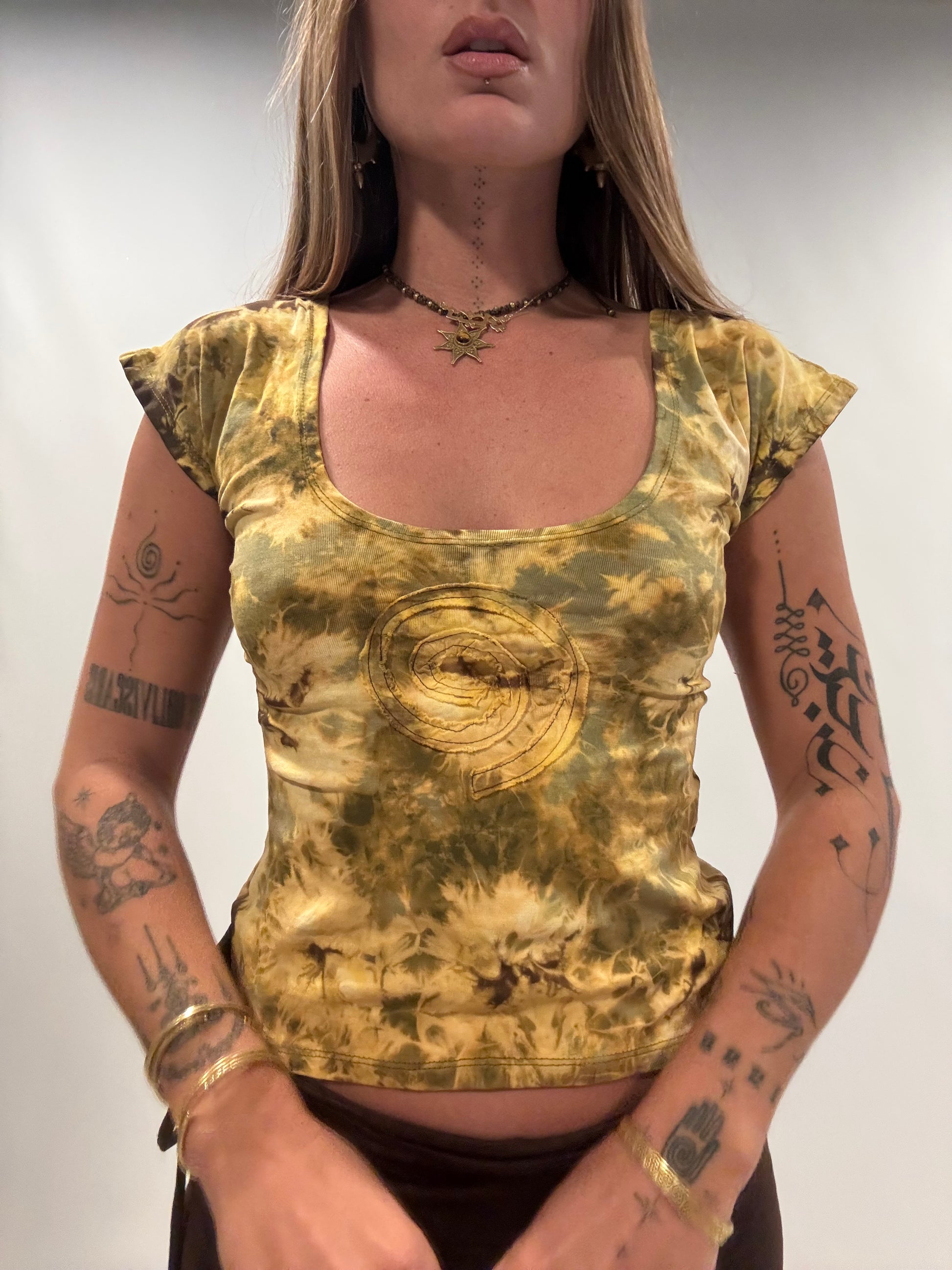 Brown tie dye with army green spiral patch. Spiral can be worn on front or back.