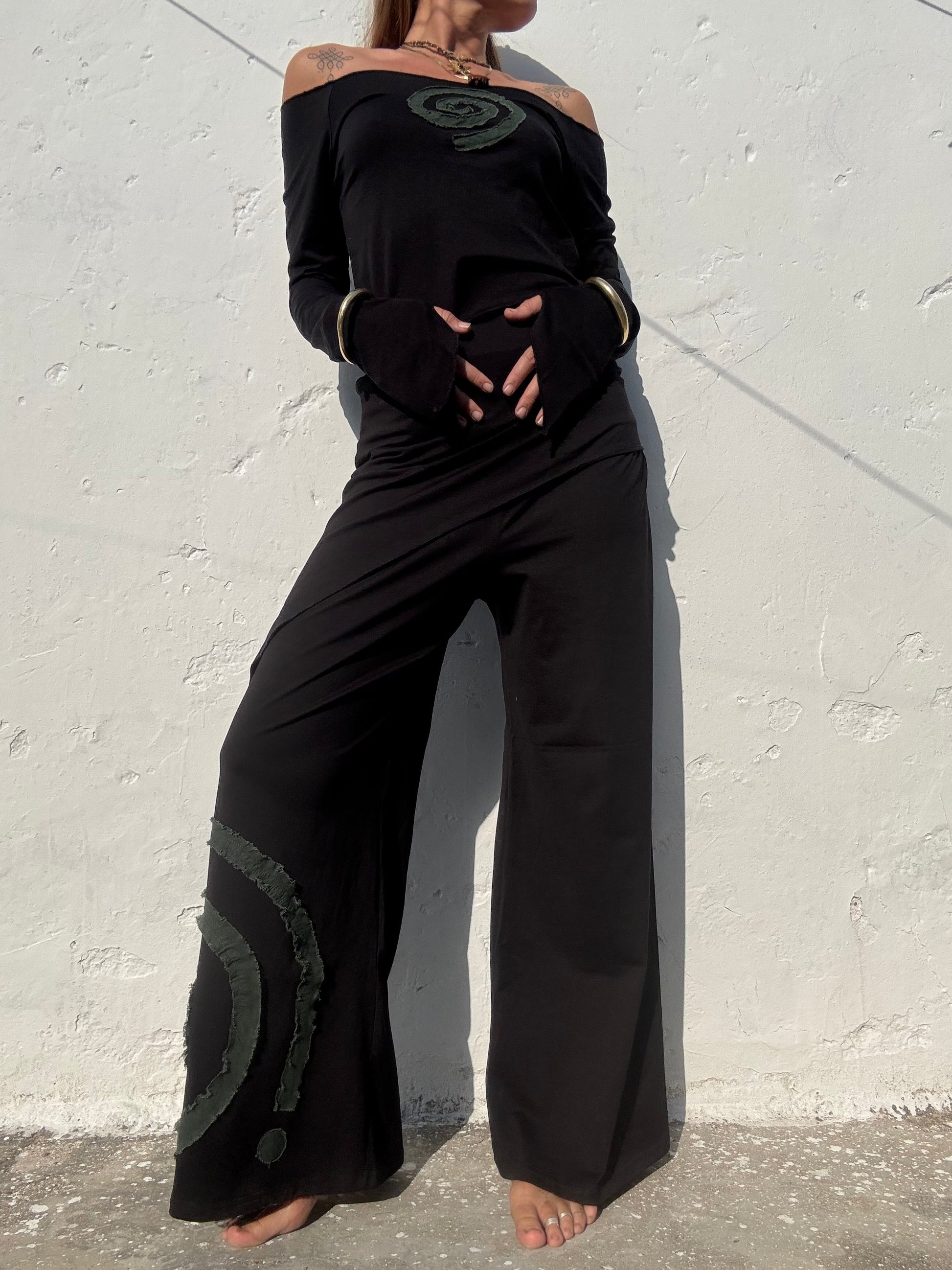 Asymmetrical cut, army green spiral patch, and little thumb holes. Can be worn as a top or a dress, spiral can be worn on front or back.